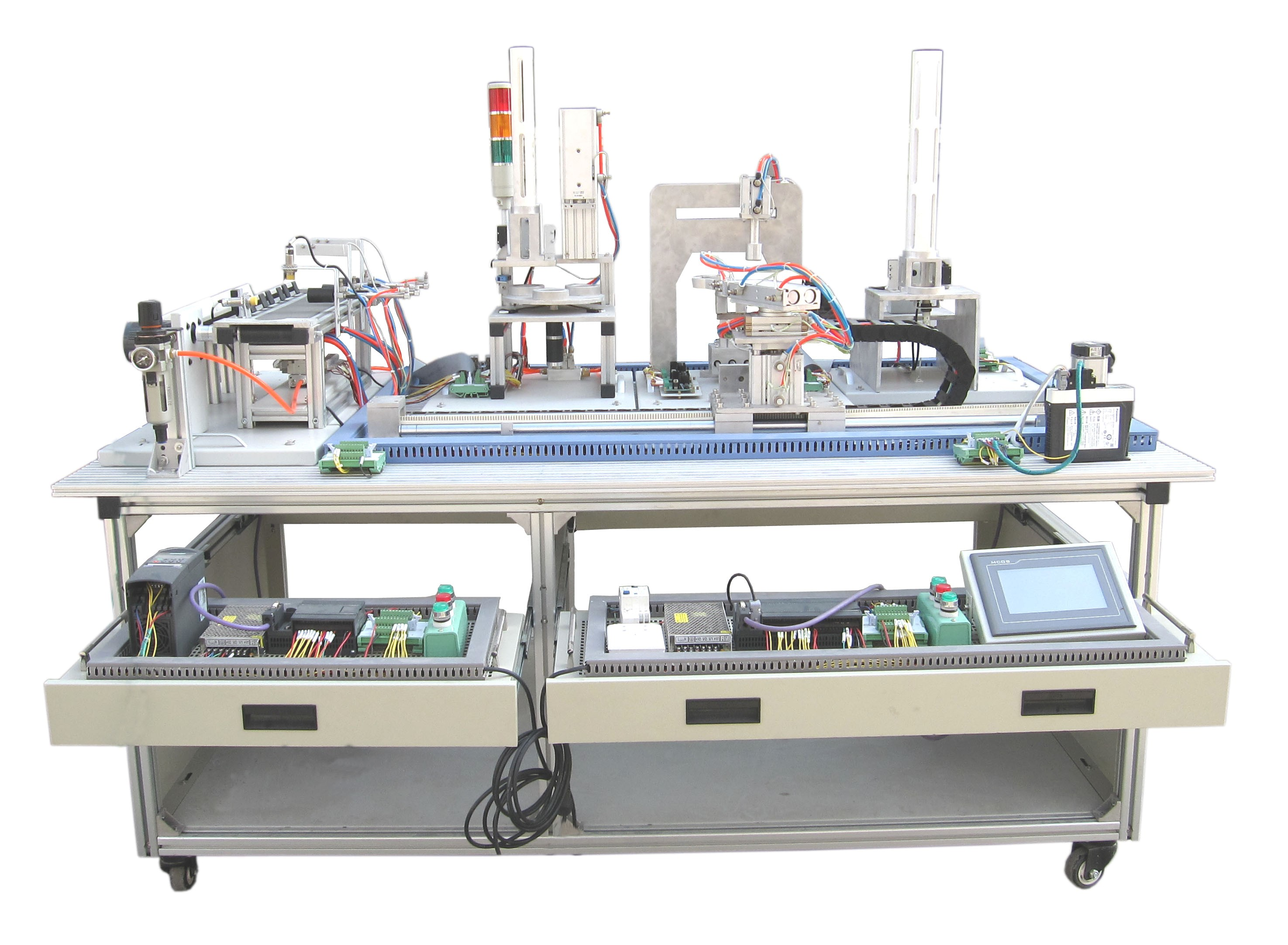 機(jī)電一體化技術(shù)實(shí)訓(xùn)設(shè)備是指機(jī)械技術(shù)、電工電子技術(shù)、微電子技術(shù)、信息技術(shù)、傳感器技術(shù)、接口技術(shù)、信號(hào)變換技術(shù)等多種技術(shù)進(jìn)行有機(jī)地結(jié)合,并綜合應(yīng)用到實(shí)際中去的技能實(shí)訓(xùn)綜合技術(shù),現(xiàn)代化的自動(dòng)生產(chǎn)設(shè)備幾乎可以說都是機(jī)電一體化的設(shè)備。自動(dòng)化生產(chǎn)線實(shí)訓(xùn)考核系統(tǒng),可以培養(yǎng)和提高學(xué)生專業(yè)綜合能力,是一種重要的實(shí)訓(xùn)設(shè)備。自動(dòng)化生產(chǎn)線實(shí)訓(xùn)系統(tǒng)、基于PLC技術(shù)的自動(dòng)化生產(chǎn)線實(shí)訓(xùn)考核系統(tǒng),可以培養(yǎng)和提高學(xué)生專業(yè)綜合能力,是一種重要的實(shí)訓(xùn)設(shè)備。自動(dòng)化生產(chǎn)線實(shí)訓(xùn)系統(tǒng)整體包括自動(dòng)供料、檢測(cè)傳輸、檢測(cè)加工、自動(dòng)裝配、自動(dòng)分揀等工序,很好的將機(jī)械技術(shù)、微電子技術(shù)、電工電子技術(shù)、傳感測(cè)試技術(shù)、接口技術(shù)、信息變換技術(shù)、網(wǎng).絡(luò)通信技術(shù)等多種技術(shù)有機(jī)地結(jié)合。該系統(tǒng)中自動(dòng)分揀站的設(shè)計(jì)過程,包括系統(tǒng)硬件設(shè)計(jì)、PLC控制設(shè)計(jì)和程序設(shè)計(jì)方法。現(xiàn)代化的自動(dòng)生產(chǎn)設(shè)備的最大特點(diǎn)是它的綜合性和系統(tǒng)性,在這里,機(jī)械技術(shù)、微電子技術(shù)、電工電子技術(shù)、傳感測(cè)試技術(shù)、接口技術(shù)、信息變換技術(shù)、網(wǎng)絡(luò)通信技術(shù)等多種技術(shù)有機(jī)地結(jié)合,并綜合應(yīng)用到生產(chǎn)設(shè)備中:而系統(tǒng)性指的是,生產(chǎn)線的傳感檢測(cè)、傳輸與處理、控制、執(zhí)行與驅(qū)動(dòng)等機(jī)構(gòu)在微處理單元的控制下協(xié)調(diào)有序地工作,有機(jī)地融合在一起。可編程序控制器(PLC)以其高抗干擾能力、高可靠性、高性能價(jià)格比且編程簡(jiǎn)單而廣泛地應(yīng)用在現(xiàn)代化的自動(dòng)生產(chǎn)設(shè)備中,擔(dān)負(fù)著生產(chǎn)線的大腦一微 處理單元的角色。因此,培養(yǎng)掌握機(jī)電一體化技術(shù),掌握PLC技術(shù)及PLC網(wǎng)絡(luò)技術(shù)的技術(shù)人材是當(dāng)務(wù)之急。而一套基于PLC技術(shù)的自動(dòng)化生產(chǎn)線實(shí)訓(xùn)考核設(shè)備可以模擬一個(gè)與實(shí)際生產(chǎn)情況+分接近的控制過程,使學(xué)習(xí)者得到一個(gè)非常接近于實(shí)際的教學(xué)設(shè)備環(huán)境,從而縮短了理論教學(xué)與實(shí)際應(yīng)用之間的距離。自動(dòng)分揀站需完成對(duì)上一單元送來的已加工、裝配的工件進(jìn)行分揀。使不同顏色的工件從不同的料槽分流的功能。當(dāng)輸送站送來工件放到傳送帶上并為入料口光電傳感器檢測(cè)到時(shí),即啟動(dòng)變頻器,工件開始送入分揀區(qū)進(jìn)行分揀。上海碩博弘揚(yáng)大國(guó)工匠精神, 發(fā)展職業(yè)教育,應(yīng)用教學(xué)設(shè)備,為企業(yè)培養(yǎng)高技能人才,而專業(yè)生產(chǎn):光機(jī)電一體化(自動(dòng)生產(chǎn)線)實(shí)訓(xùn)裝置、灌裝自動(dòng)化生產(chǎn)線實(shí)訓(xùn)裝置、工業(yè)自動(dòng)生產(chǎn)線實(shí)訓(xùn)裝置 、工業(yè)控制模擬實(shí)訓(xùn)裝置 、機(jī)電一體化組合實(shí)訓(xùn)平臺(tái) 、機(jī)電一體化綜合實(shí)訓(xùn)考核裝置、自動(dòng)化生產(chǎn)安裝與調(diào)試實(shí)訓(xùn)裝置 、光機(jī)電一體化高速分揀實(shí)訓(xùn)系統(tǒng) 、典型機(jī)電設(shè)備安裝與控制實(shí)訓(xùn)裝置、模塊式柔性自動(dòng)環(huán)形生產(chǎn)線實(shí)驗(yàn)系統(tǒng)(帶機(jī)器人工程型)、立體停車庫實(shí)物教學(xué)實(shí)驗(yàn)裝置、機(jī)電一體化柔性生產(chǎn)線加工實(shí)訓(xùn)系統(tǒng)(5站)、網(wǎng)絡(luò)型模塊式柔性自動(dòng)化生產(chǎn)線實(shí)驗(yàn)系統(tǒng)、模塊式柔性自動(dòng)環(huán)形生產(chǎn)線實(shí)驗(yàn)系統(tǒng)(工程型)、柔性生產(chǎn)制造實(shí)驗(yàn)系統(tǒng)(工程型)、現(xiàn)代物流倉儲(chǔ)自動(dòng)化實(shí)驗(yàn)系統(tǒng)、運(yùn)動(dòng)實(shí)訓(xùn)裝置、循環(huán)搬運(yùn)自動(dòng)控制實(shí)訓(xùn)裝置、平面雙軸運(yùn)行控制實(shí)訓(xùn)裝置、工業(yè)機(jī)械手實(shí)訓(xùn)裝置、物料分揀實(shí)訓(xùn)裝置、機(jī)械手實(shí)訓(xùn)裝置 、立體倉庫實(shí)訓(xùn)裝置、十字路口交通燈實(shí)訓(xùn)系統(tǒng)、機(jī)電液氣一體化綜合實(shí)訓(xùn)裝置、光機(jī)電一體化高速分揀實(shí)訓(xùn)系統(tǒng)、步進(jìn)伺服控制綜合實(shí)訓(xùn)平臺(tái)、光機(jī)電氣一體化控制實(shí)訓(xùn)系統(tǒng)、 光機(jī)電一體化綜合實(shí)訓(xùn)考核裝置、光機(jī)電一體化實(shí)訓(xùn)考核裝置、光機(jī)電一體化實(shí)訓(xùn)考核裝置、光機(jī)電氣一體化控制實(shí)訓(xùn)系統(tǒng)、自動(dòng)生產(chǎn)線拆裝與調(diào)試實(shí)訓(xùn)裝置、柔性自動(dòng)化生產(chǎn)線實(shí)訓(xùn)系統(tǒng)。