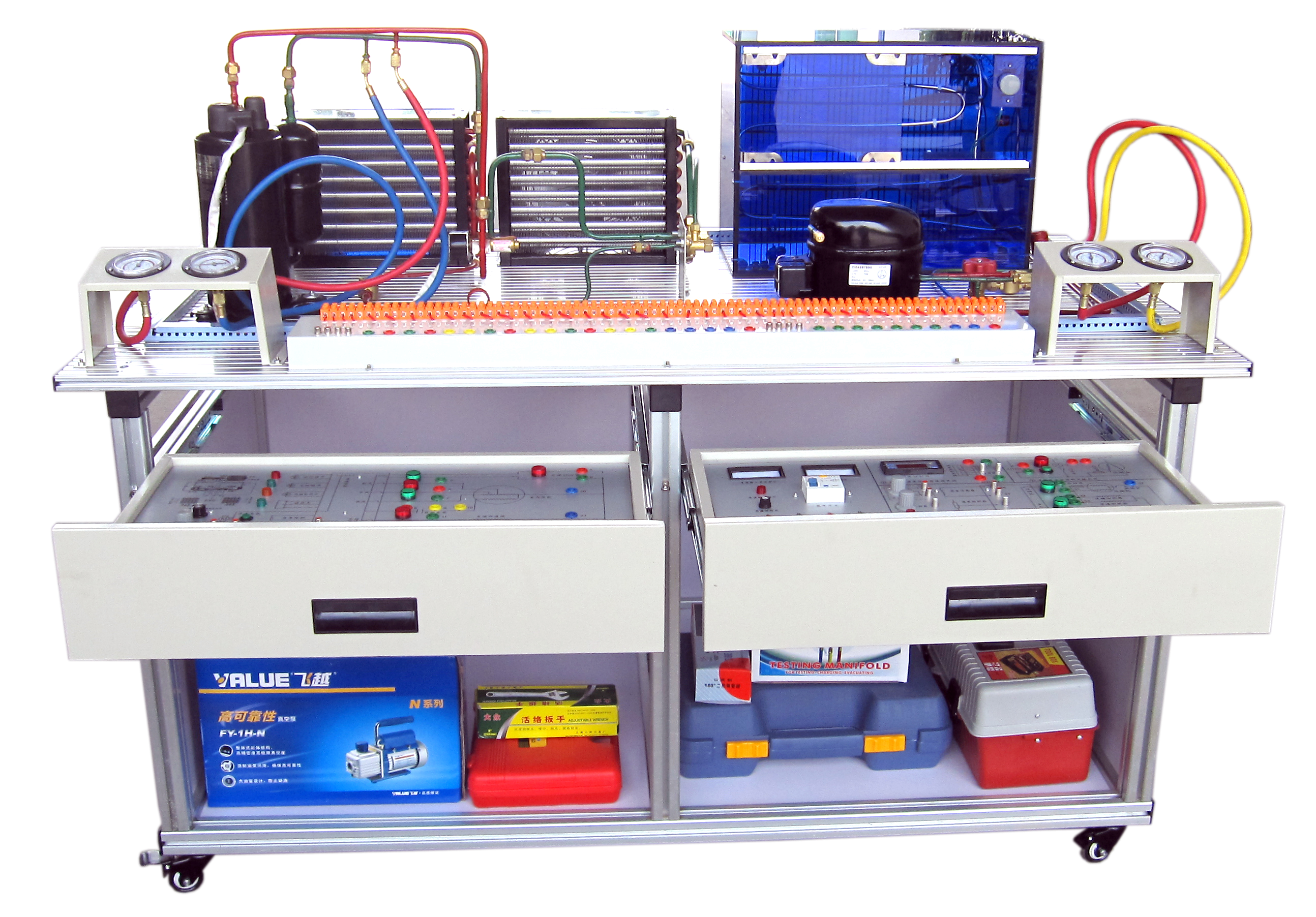制冷制熱實(shí)訓(xùn)設(shè)備、制冷制熱實(shí)訓(xùn)裝置是職業(yè)技能課程制冷制熱教學(xué)實(shí)訓(xùn)設(shè)備,冰箱實(shí)訓(xùn)設(shè)備、空調(diào)實(shí)訓(xùn)設(shè)備主要承擔(dān)電類(lèi)專(zhuān)業(yè)的《制冷制熱技術(shù)》等課程的實(shí)訓(xùn)教學(xué)任務(wù),同時(shí)可面向社會(huì)開(kāi)展制冷設(shè)備維修工(中、高級(jí))和家用電器產(chǎn)品維修工(中、高級(jí))職業(yè)技能培訓(xùn)與鑒定工作。制冷制熱實(shí)訓(xùn)設(shè)備屬于教、學(xué)、做一體化實(shí)訓(xùn)室,制冷制熱儀器設(shè)備可供學(xué)生完成《制冷制熱技術(shù)》等課程的實(shí)訓(xùn)教學(xué)。主要可對(duì)學(xué)生開(kāi)展冰箱電氣檢修、空調(diào)檢修、空調(diào)移機(jī)、制冷劑加注、管路操作等實(shí)訓(xùn)內(nèi)容,并具備制冷維修工技能鑒定資質(zhì)。教學(xué)做、理實(shí)一體化,增加了師生之間的互動(dòng),提高了教學(xué)效果。在組裝調(diào)試過(guò)程中,學(xué)生遇到故障問(wèn)題,指導(dǎo)老師幫助其分析故障原因,指導(dǎo)學(xué)生動(dòng)手解決故障問(wèn)題。制冷制熱實(shí)訓(xùn)裝置特色是:實(shí)訓(xùn)設(shè)備全面的涵蓋了制冷、制熱等電器的所有原理性電路,既能夠讓學(xué)生迅速融入實(shí)物學(xué)習(xí)的外觀體現(xiàn),也能夠?qū)﹄娖鞯慕Y(jié)構(gòu)和組成有清楚的認(rèn)識(shí)。實(shí)訓(xùn)室有大量的舊冰箱、空調(diào)實(shí)物可供學(xué)生拆卸、組裝,讓學(xué)生對(duì)制冷制熱設(shè)備有更加深刻的理解。通過(guò)實(shí)制冷制熱實(shí)訓(xùn)教學(xué),可使學(xué)生熟悉常用儀器儀表,熟練使用儀器儀表,更好的掌握制冷制熱裝置的維修技術(shù),為以后的發(fā)展奠定基礎(chǔ),從而提高學(xué)生實(shí)際動(dòng)手能力和就業(yè)競(jìng)爭(zhēng)力。制冷設(shè)備運(yùn)用與維修,培養(yǎng)在制冷與空調(diào)制造行業(yè),從事產(chǎn)品設(shè)計(jì)、技術(shù)管理與質(zhì)量管理;在制冷與空調(diào)設(shè)備經(jīng)營(yíng)行業(yè),從事產(chǎn)品的銷(xiāo)售、售后服務(wù)和經(jīng)營(yíng)管理;在制冷與空調(diào)設(shè)備使用單位,從事制冷與空調(diào)系統(tǒng)運(yùn)行管理和操作維修的中、高技能人才。制冷技術(shù)、制冷基礎(chǔ)技能實(shí)訓(xùn)、冰箱、家用空調(diào)器原理與維修、工程熱力學(xué)、電工基礎(chǔ)及實(shí)訓(xùn)、電力拖動(dòng)原理與技能實(shí)訓(xùn)、工程制圖與CAD、中央空調(diào)運(yùn)行管理與維護(hù)、汽車(chē)空調(diào)安裝及維修、冷庫(kù)設(shè)計(jì)安裝與維護(hù)、制冷空調(diào)自動(dòng)控制技術(shù)等課程。畢業(yè)就業(yè)方向:空調(diào)生產(chǎn)企業(yè)的質(zhì)檢、工藝、基層管理、生產(chǎn)設(shè)備維護(hù)工作,中央空調(diào)、冷庫(kù)的安裝、運(yùn)行管理、維護(hù),空調(diào)工程的預(yù)算、輔助設(shè)計(jì)工作,空調(diào)、冷庫(kù)和制冷設(shè)備等空調(diào)制冷行業(yè)的營(yíng)銷(xiāo)、銷(xiāo)售代理、售后服務(wù)工作。 上海碩博弘揚(yáng)大國(guó)工匠精神, 發(fā)展職業(yè)教育,應(yīng)用教學(xué)設(shè)備,為企業(yè)培養(yǎng)高技能人才,而專(zhuān)業(yè)生產(chǎn):制冷與空調(diào)實(shí)訓(xùn)設(shè)備、可視化制冷性能測(cè)試培訓(xùn)裝置、一機(jī)兩庫(kù)系統(tǒng)綜合實(shí)訓(xùn)裝置、小型冷庫(kù)制冷系統(tǒng)綜合實(shí)訓(xùn)考核裝置、小型冷庫(kù)制冷系統(tǒng)實(shí)訓(xùn)考核裝置、熱空調(diào)制冷制熱系、實(shí)訓(xùn)考核裝置、整體式空調(diào)電氣實(shí)訓(xùn)智能考核裝置、變頻空調(diào)電氣實(shí)訓(xùn)智能考核裝置、空調(diào)冰箱組裝與調(diào)試實(shí)訓(xùn)考核裝置(智能考核型)、制冷系統(tǒng)原理與性能測(cè)試多功能實(shí)驗(yàn)裝置、空調(diào)與冰箱組裝及電氣控制系統(tǒng)原理與維修實(shí)訓(xùn)臺(tái)、現(xiàn)代制冷與空調(diào)系統(tǒng)實(shí)訓(xùn)考核裝置、電冰箱制冷系統(tǒng)實(shí)訓(xùn)考核裝置(直冷)、冰箱技能實(shí)訓(xùn)考核裝置、家用電冰箱微電腦式溫控電氣實(shí)訓(xùn)考核裝置、空調(diào)/冰箱制冷制熱實(shí)訓(xùn)考核裝置、變頻空調(diào)電氣實(shí)訓(xùn)智能考核裝置、半導(dǎo)體制冷技術(shù)實(shí)訓(xùn)裝置、智能型制冷壓縮機(jī)性能測(cè)試實(shí)訓(xùn)裝置、柜式空調(diào)技能綜合實(shí)訓(xùn)考核裝置、制冷電路電氣控制實(shí)訓(xùn)板、制冷管路維修基本技能實(shí)訓(xùn)裝置、壓縮機(jī)解剖,拆裝實(shí)訓(xùn)設(shè)備、制冷制熱實(shí)驗(yàn)室設(shè)備、整體式空調(diào)電氣實(shí)訓(xùn)考核裝置、低溫箱電氣實(shí)訓(xùn)智能考核裝置、一機(jī)兩庫(kù)電氣實(shí)訓(xùn)考核裝置、組合式空調(diào)機(jī)組實(shí)訓(xùn)裝置、空調(diào)制冷綜合實(shí)訓(xùn)裝置、除濕機(jī)維修技能與考核裝置、空調(diào)制冷換熱綜合實(shí)驗(yàn)裝置、制冷制熱維修測(cè)試綜合實(shí)訓(xùn)平臺(tái)、制冷壓縮機(jī)性能測(cè)定實(shí)驗(yàn)裝置、制冷制熱實(shí)驗(yàn)室設(shè)備(制冷制熱實(shí)驗(yàn)臺(tái)、制冷空調(diào)實(shí)驗(yàn)臺(tái))、變頻