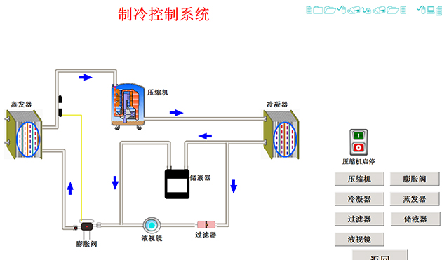5、工作流程圖板3套:工作流程圖板詳細說明制冷系統(tǒng)流程、監(jiān)測點溫度、系統(tǒng)壓力、工作狀態(tài)指示、系統(tǒng)部件說明。