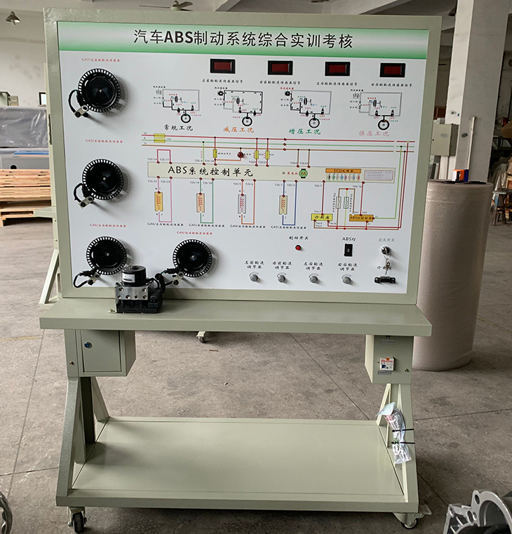 ABS控制單元、ABS電磁閥總成、輪速傳感器、制動開關(guān)等。檢測端子、故障設(shè)置系統(tǒng)、大容量蓄電池或12V開關(guān)電源、大型彩色噴繪電路原理圖、控制面板、可移動臺架、使用說明書及任務(wù)驅(qū)動式實訓(xùn)指導(dǎo)書等。