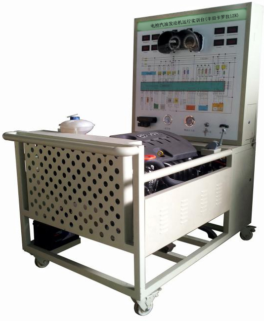 該設(shè)備采用翻新豐田卡羅拉1ZR電控汽油發(fā)動機(jī)總成及運行附件的固定臺架和運行檢測控制面板臺架兩部分組成。