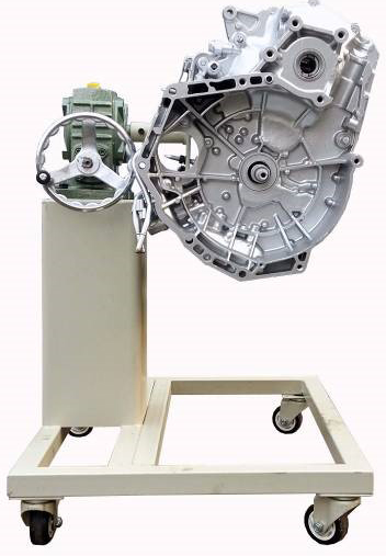 采用減速翻轉(zhuǎn)機構(gòu),可使變速器旋轉(zhuǎn)任意角度,并能任意位置鎖止,便于學(xué)生從不同的角度進行拆卸和裝配。