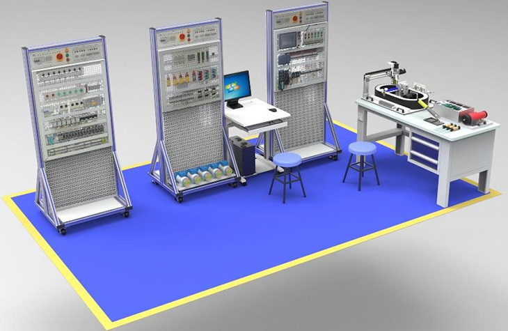 4.1功能:掛板集成安裝有 PLC 控制器、觸摸屏、變頻器、伺服系統(tǒng)、步進(jìn)系統(tǒng)、指示燈按鈕模塊等,所有器件端口引至接線端子,配合環(huán)形傳送分揀任務(wù)模型,完成接線、編程、調(diào)試等實(shí)訓(xùn)。