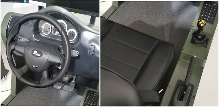 2)開(kāi)放式艙體,方向盤(pán)、變速機(jī)構(gòu)、手制動(dòng)、加油踏板、制動(dòng)踏板、離合器踏板等實(shí)裝主要操作部件均需要模擬,其外觀尺寸、部署相對(duì)位置、操作行程,以及操作力度感受與實(shí)際基本一致,操縱機(jī)件性能工作可靠、操作靈活、低噪音。