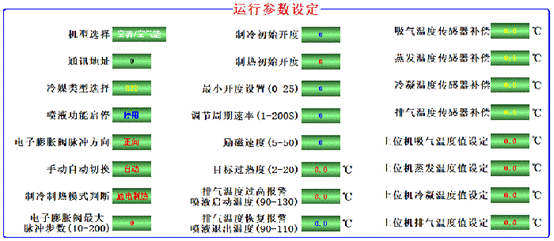 11)顯示界面上29 路參數(shù)控制參數(shù)設(shè)置/查詢:控制器內(nèi)所有與控制相關(guān)的溫度參數(shù)、時間參數(shù)、控制參數(shù)、等29個參數(shù)都可以調(diào)整,以適應制冷/熱泵/冷庫/水機等設(shè)備。