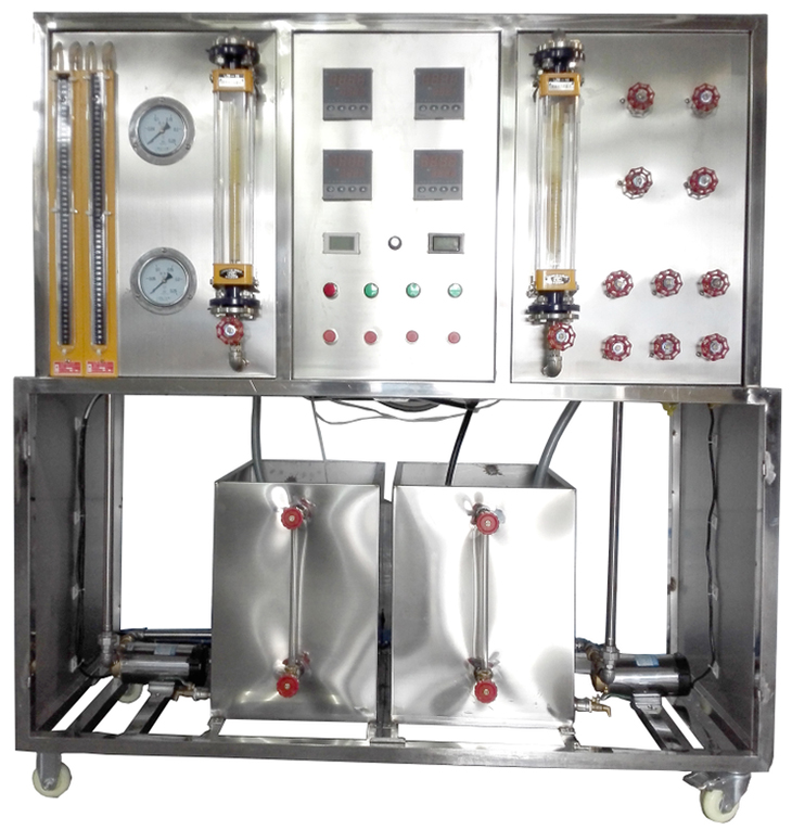 鋼原水箱及加熱水箱,順、逆流調(diào)節(jié)閥門組,阻力測(cè)試壓力表及U型差壓計(jì),加熱功率由固體調(diào)壓模塊無(wú)級(jí)調(diào)節(jié),萬(wàn)能信號(hào)輸入巡檢儀顯示溫度,電流表,電壓表,不銹鋼臺(tái)架及控制屏等。