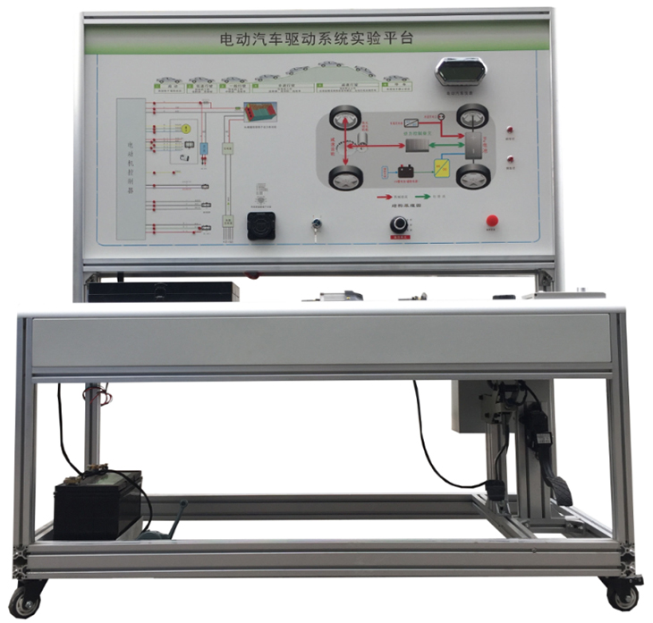 檢測控制面板(裝有各種檢測端子,1448×940mm彩色電路圖和工作原理示意圖)、組合儀表、點火開關、電機控制器、車載充電器與充電接口、DC-DC轉(zhuǎn)換器、鋰動力電池組、電動車電機(直流無刷電機)與變速箱、后輪左右液壓制動裝置、驅(qū)動橋傳動裝置、剎車開關、檔位開關、油門控制裝置、大電流繼電器、電源總開關、急停開關、輔助蓄電池(12V45AH)、一體化全鋁合金型材搭建的移動臺架(1500×700×1700mm (帶自鎖腳輪裝置,帶安裝檢測端子的原理面板,面板1448×940mm)、故障考核系統(tǒng)、設備操作說明書。