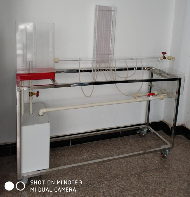 儲(chǔ)水箱、上水管、溢流管、整流柵、溢流板、溢流箱、取壓管、閥門、測(cè)壓板、回水箱、計(jì)量箱、回水管;移動(dòng)式不銹鋼實(shí)驗(yàn)臺(tái);